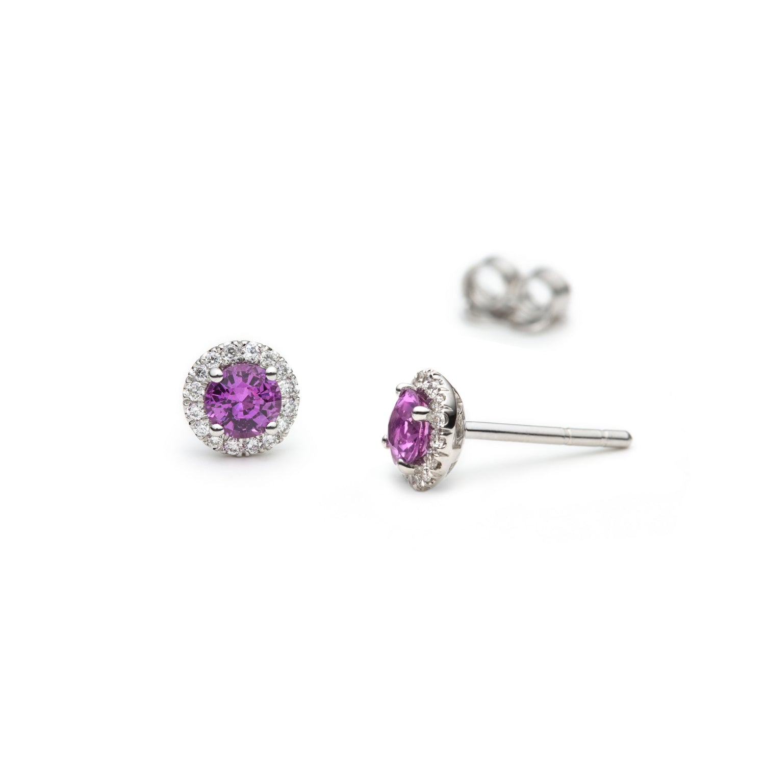 Boucle d'oreille clou avec saphir rose taille rond et halo de diamants