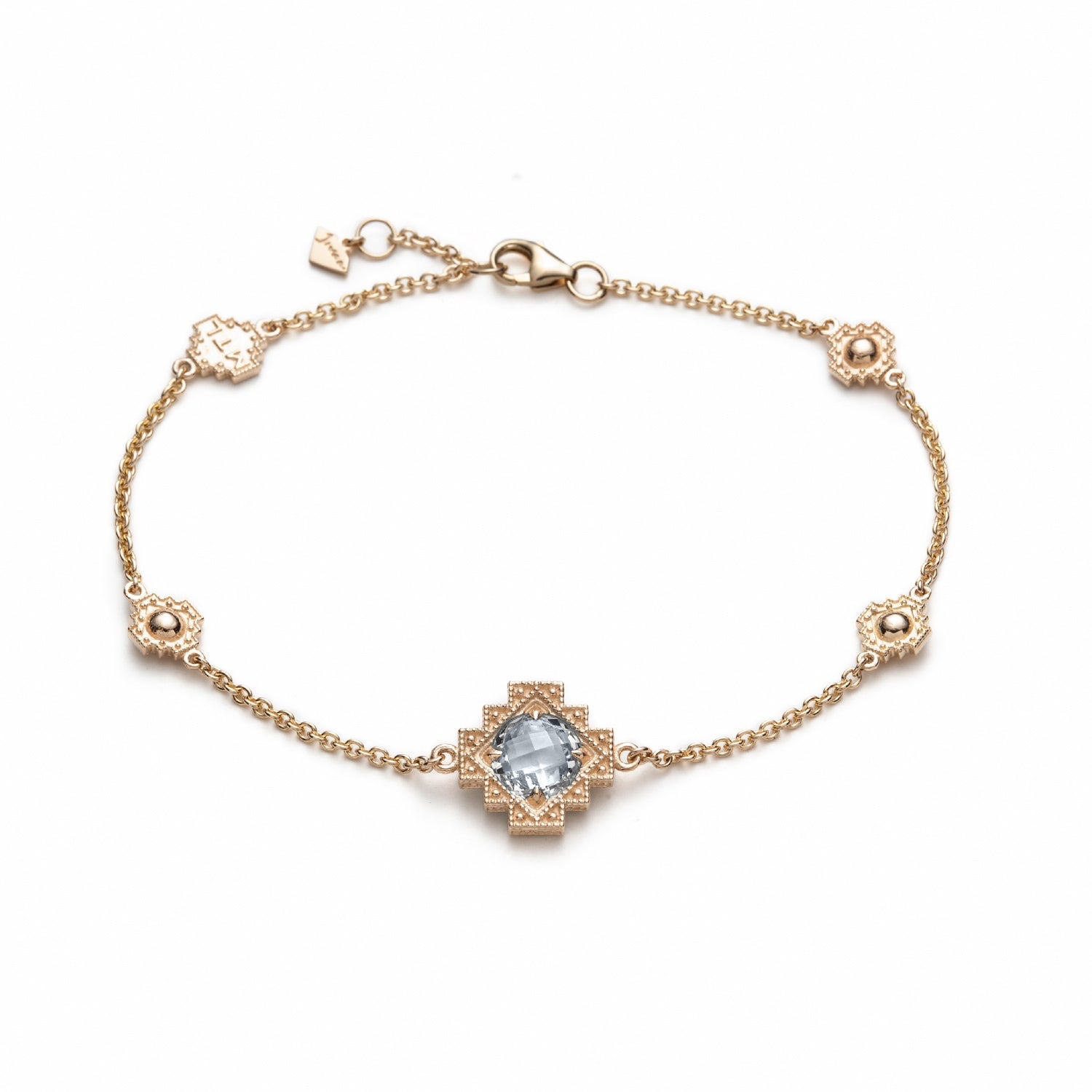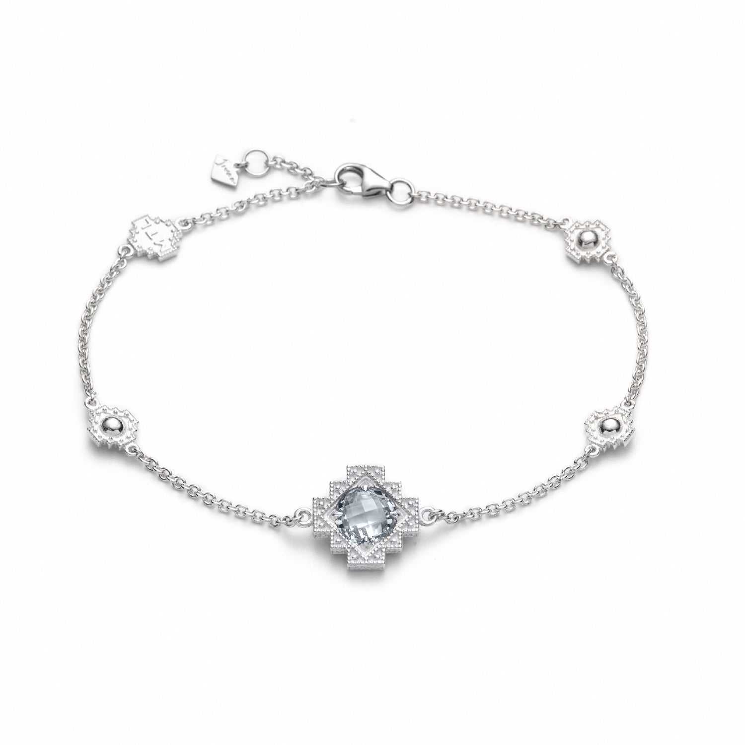Ce bracelet éblouissant présente une topaze blanche naturelle taillée en damier, sertie dans un motif à étape signature, accentué de mini motifs en milgrain le long d'une chaîne ajustable. Rehaussez votre style et faites une déclaration avec ce bracelet exquis qui combine harmonieusement beauté et grâce.