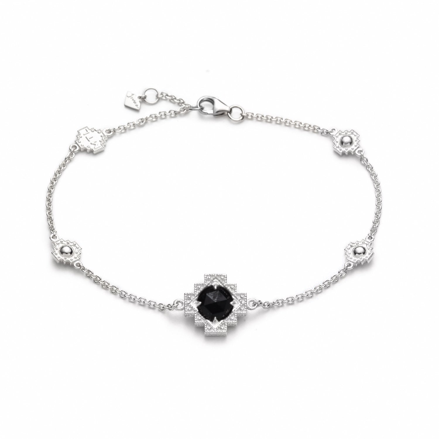 Ce superbe bracelet présente un onyx noir naturel taillé en rose double-face, monté dans un motif d'étape signature accentué de mini motifs de milgrain le long d'une chaîne ajustable. Fabriqué avec une attention exquise aux détails, ce bracelet est parfait pour toute occasion, offrant un style sans effort et une touche de sophistication.