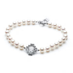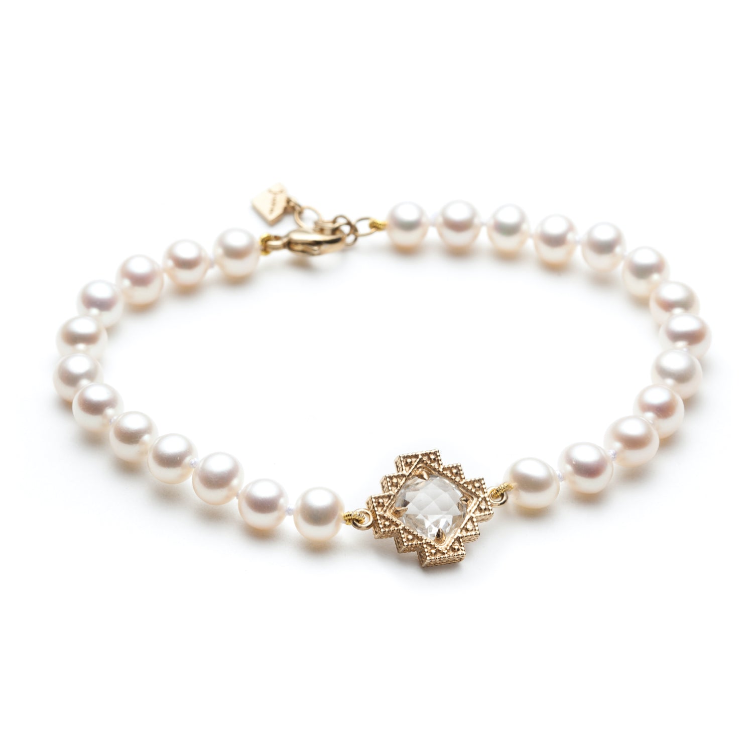 Ce bracelet élégant présente une topaze blanche naturelle taillée en rose double-face dans un motif d'étape signature avec milgrain, parfaitement complétée par une chaîne de perles d'eau douce blanches à haute lustre. Rehaussez votre style avec ce bracelet intemporel, parfait pour ajouter une touche de sophistication à toute tenue.