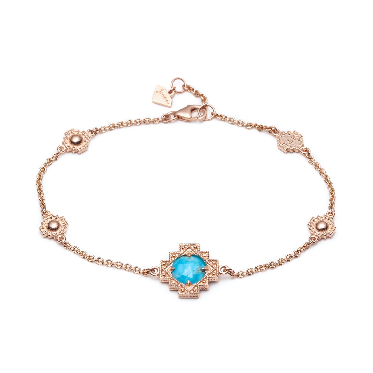 Ce superbe bracelet présente une turquoise naturelle taillée en rose double-face, montée dans un motif d'étape signature accentué de mini motifs de milgrain le long d'une chaîne ajustable. Fabriqué avec une attention exquise aux détails, ce bracelet est parfait pour toute occasion, offrant un style sans effort et une touche de sophistication.