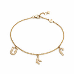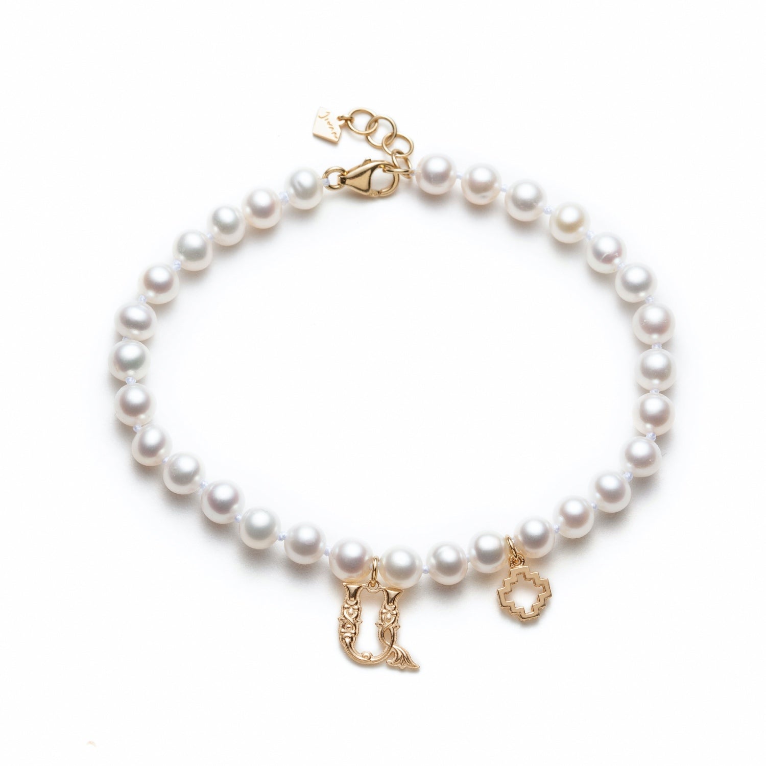 Armenian Initial and Step Motif Charm Pearl Bracelet in Yellow Gold