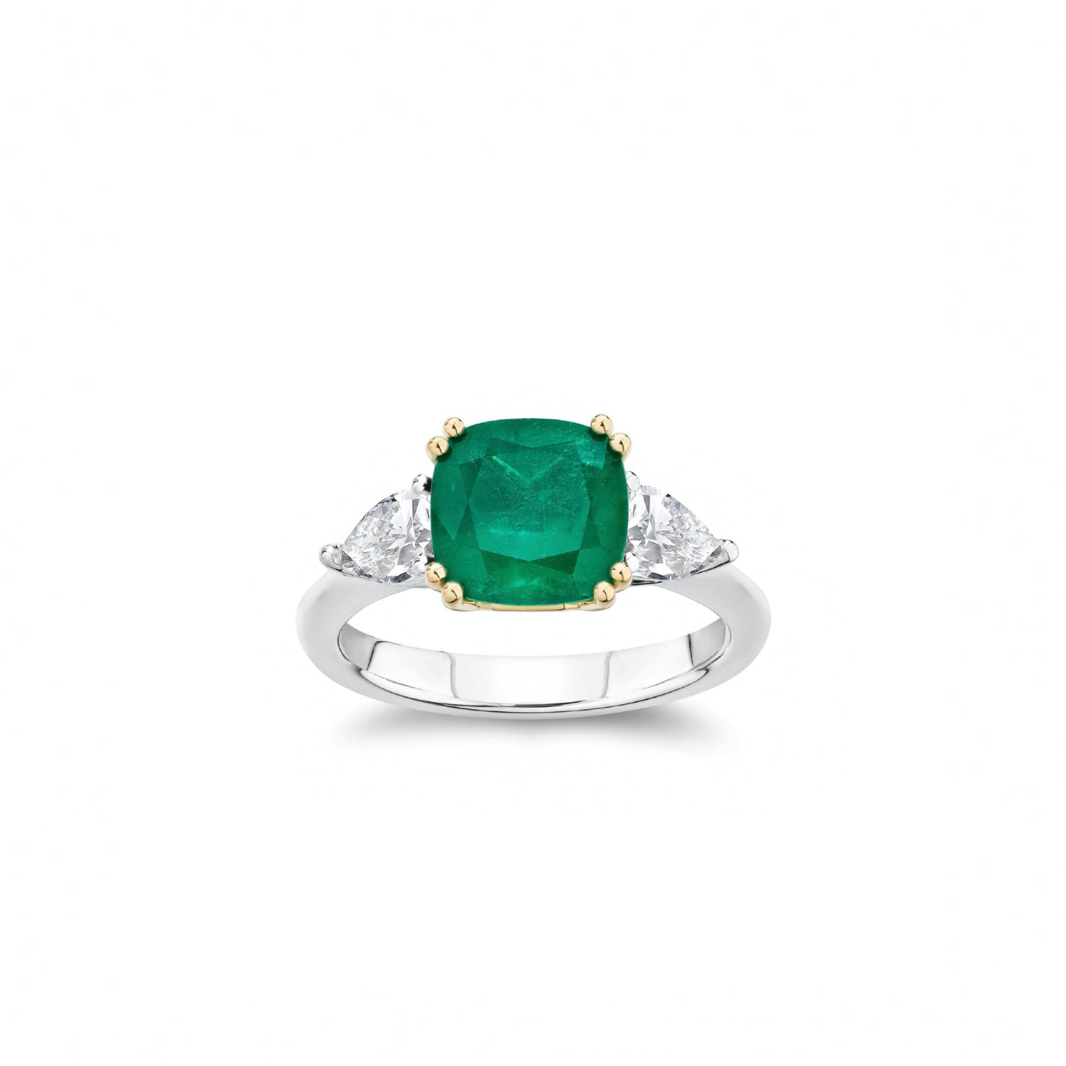 Cette bague exquise met en valeur une émeraude naturelle taille coussin dans une monture en or jaune, encadrée de deux diamants en forme de poire sertis en or blanc, symbolisant l'unicité de votre voyage amoureux. Elle capture l'essence d'un engagement durable et l'anticipation des aventures de demain.
