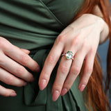 Cette bague trois pierres enchantée présente une aigue-marine bleu-vert taillée en ovale, flanquée de deux saphirs roses taillés en ovale, le tout dans un design caractéristique inspiré des sirènes et accentué d'une bande pavée de diamants ronds. Découvrez un symbole intemporel d'amour et de sophistication.