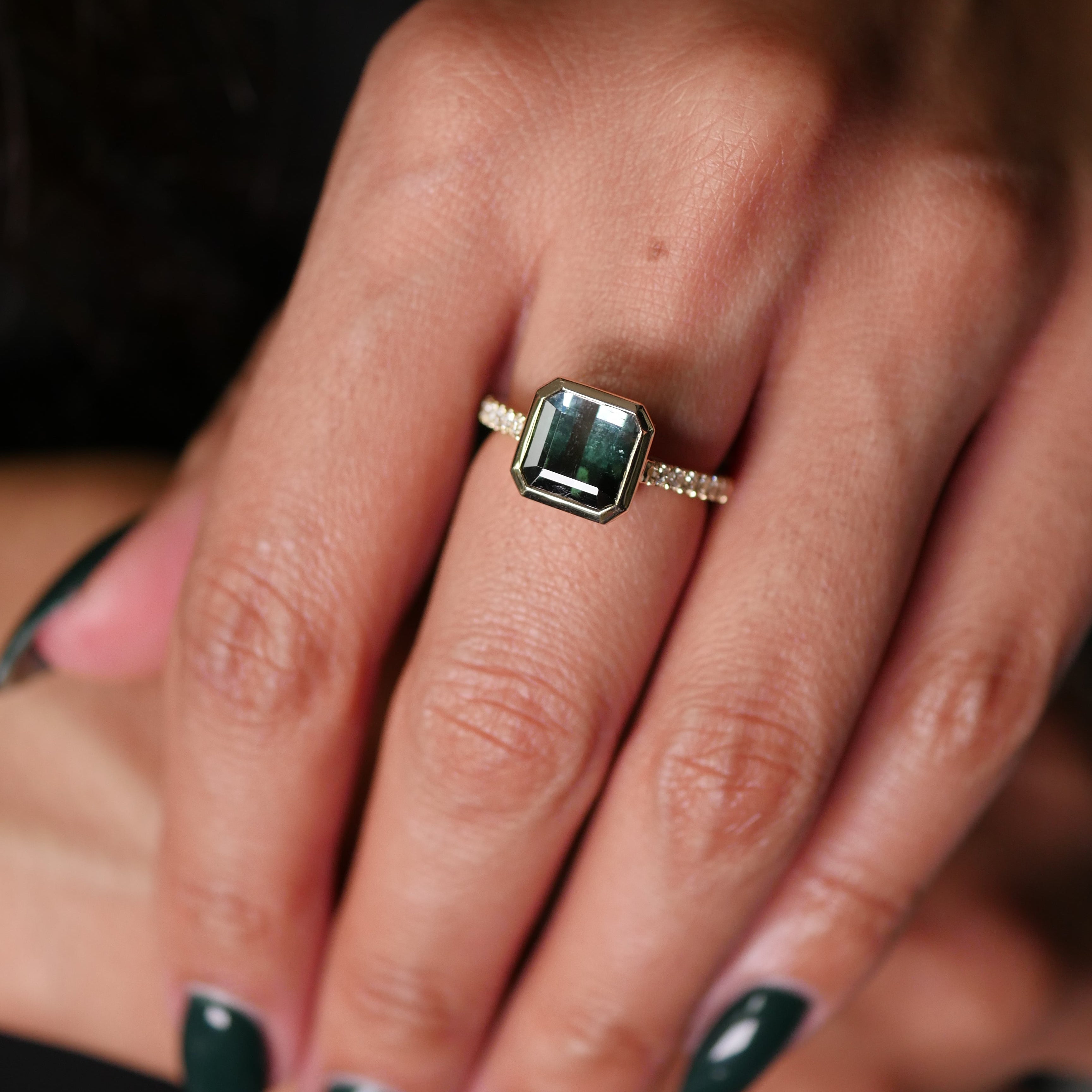 Emerald Cut Blue Tourmaline Diamond Pavé East-West Ring on a Hand