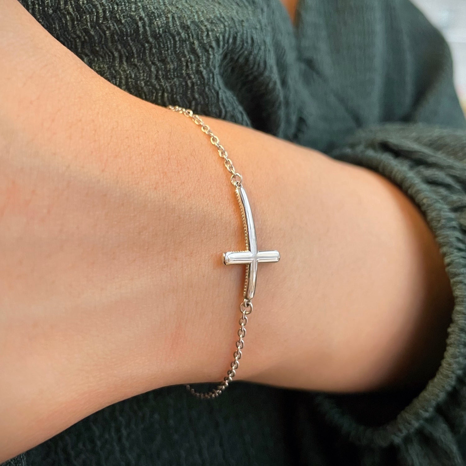 Horizontal Curved Sideways Cross Bracelet on a Hand
