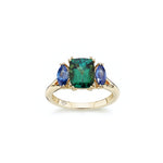 This captivating engagement ring features a cushion cut natural green tourmaline elegantly embraced by two marquise cut blue sapphires, forming a stunning trio of colours that mirror the depth of your emotions. This ring is a testament to your unique bond, where individuality harmonizes into a shared journey.