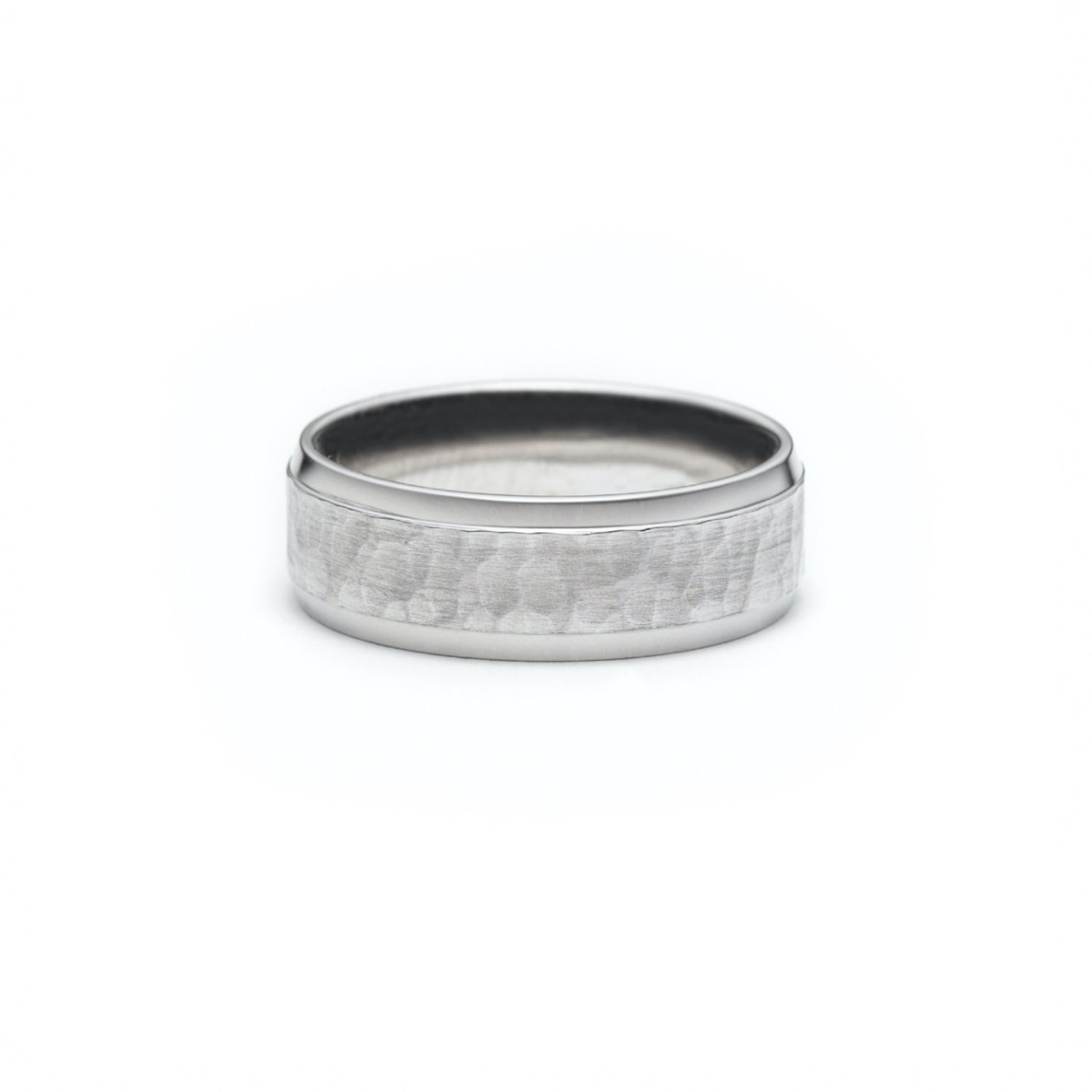 This men's wedding band features a unique hammered texture that adds a touch of rugged charm and bevelled edges to create a smooth transition, ensuring both comfort and style. Perfectly suited for those seeking a symbol of enduring love and exceptional craftsmanship, this wedding band embodies both sophistication and strength.