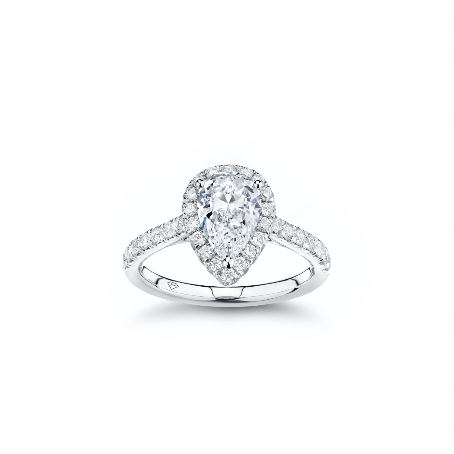 This elegant engagement ring features a pear-shaped diamond embraced by a sparkling halo of delicate diamonds while accented with diamond pavé bands. This ring epitomizes grace and sophistication, reflecting the uniqueness of your love story.