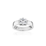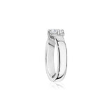 This striking engagement ring features a radiant cut diamond set in an east-west orientation upon a bold and contemporary wide band. Embrace the brilliance of your shared journey and start your forever with a touch of modern elegance.